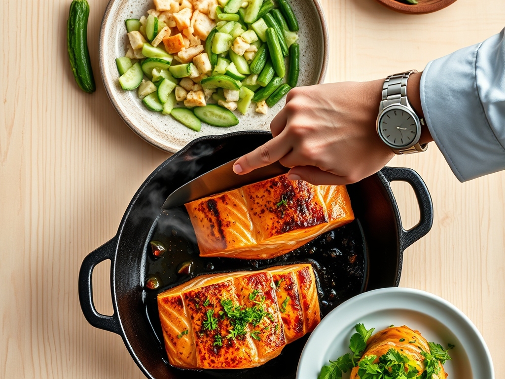 The cooking phase is a swift 12 to 15 minutes. We utilize a technique called unilateral cooking, where the salmon spends the majority of its time skin-side down. This allows the heat to migrate upward slowly, resulting in a tender, translucent center. The final 3 minutes are dedicated to the cucumber flash-sear, ensuring they remain vibrant and crunchy rather than mushy.