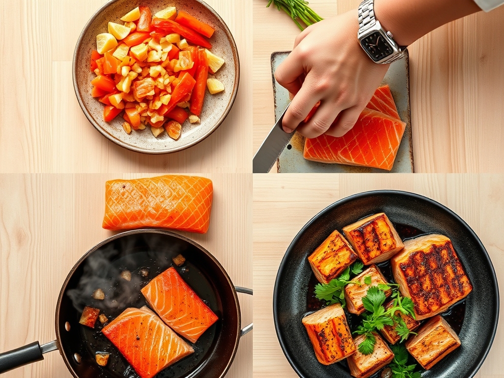 The flow begins with the "Chill Temper." Remove your salmon from the refrigerator 20 minutes before cooking. This allows the internal temperature to rise slightly, ensuring the center is not ice-cold when the exterior is perfectly seared. While the fish tempers, use your bench scraper to organize your chopped aromatics. The goal is to have every sauce component measured before the fish touches the pan. Because King Salmon has such high fat content, it retains heat longer than leaner fish; always factor in a 5-minute rest period to allow for thermal carryover.