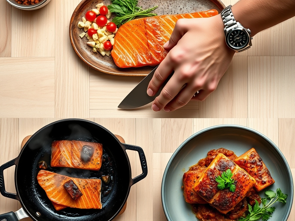 Before we ignite the flame, we must curate our mise-en-place with surgical precision. Start with center-cut Atlantic or King salmon fillets; these offer the most uniform thickness for even heat distribution. You will need a high-smoke-point fat, such as avocado oil or clarified butter, to facilitate the Maillard reaction without scorching. Gather your aromatics: fresh thyme sprigs, smashed garlic cloves, and a bright lemon for zest. For the seasoning, use a high-quality kosher salt to draw out moisture and a microplane to shave frozen ginger or citrus peel into a fine, ethereal dust.